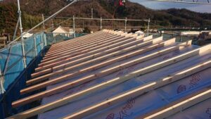 3次防水になるタイベックシルバーを敷き垂木で押さえる工事