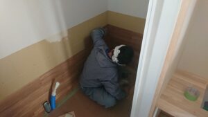 木工事もほとんど終了して、内容屋の「スーシー」フロアタイルの立ち上がりを
