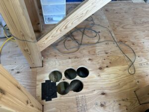 立ち上がる部分の開口もしています。丸くあけることで配管回りの空気のロス(床下の温度)が減ります。