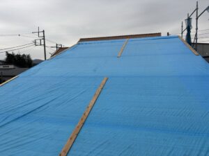 タルキ下にタイベックシルバーを敷き~タルキで押さえます。タルキが通気層になります。