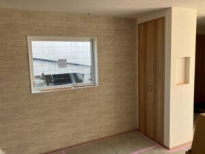 室内のアクセントクロスも貼られて良い感じになってきました。 これから室内建具~仕上の棚等を納めて来週クリーニング工事になります。