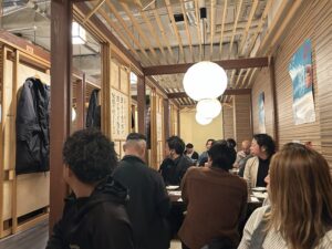 全国から大型バス1台満席(49人)が集まり、懇親会もこのような雰囲気(この列が左にもう一列あります)で