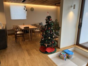 チークのYチェアが納品になり確認に行きました。クリスマスツリーがいつのまにかありました(*´Д`)