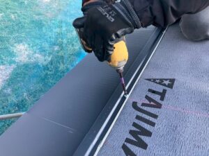 屋根工事もはじまり順調に進んでいます。このようにジョイント部分にビスで止める場所がありビス打ちを行います。