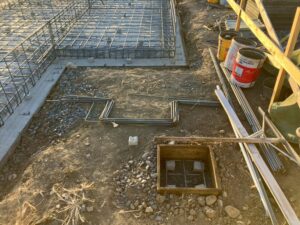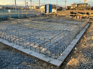 鉄筋工事が進んでいます。玄関ポーチの独立基礎の下地もできました。構造計算では、