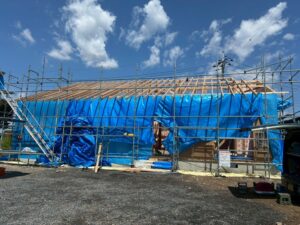 今日は、「カワマー」棟梁と、「アキラー」棟梁で野地をはじめました。平屋なので大きな家になります!