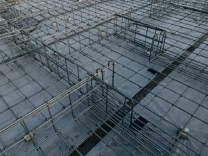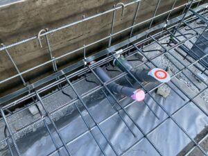 土間を打つ前に検査では、配管のかぶり厚さも検査します。アルミ(シルバー)が見えるのが水止め板です。