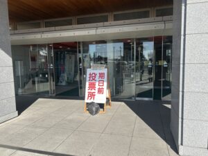 入口には、期日前投票の文字が掲げてありました。 投票のはがきが今日来たので今度の日曜日が投票日とは、・・今日実感しました( 一一)