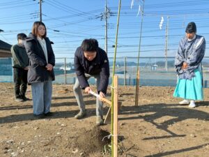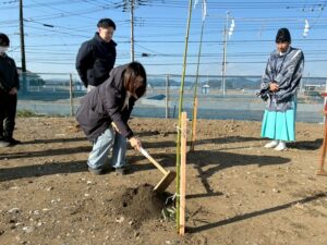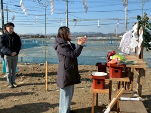 続きまして鍬入れ「うがち初め」の儀式を 旦那さまから「エイ!エイ!エイ!」