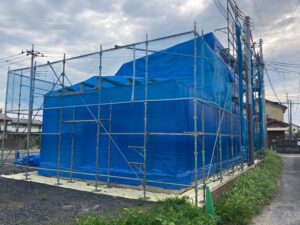今日も暑い一日でした。 今日も場所により不安定な一日でした。 今日は、植下町のO様邸の建て方を行いました。終了してシート養生した現場です。 こちらは、西道路から見た写真です。 室内は、落下防止ネットも設置し […]