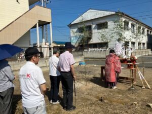 今日も暑い日が続きますね。 今日は、足利市鹿島町のN様邸の地鎮祭を行いました。 「四方払い」から起工式を行いました。 今日はじめてカメラマンでの参加「みーさん」(半田さん)頑張ってますね! 「鍬入れの儀式 […]