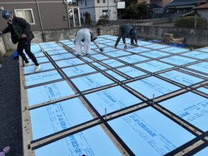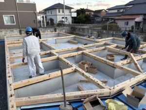 今日金曜日は、朝会です。 床断熱土台も進んでいます。