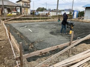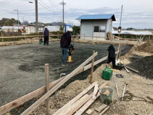 いい感じで進んでいます。 地盤の固めが終了しますとターミダンシートを敷いて~外回り捨コンをうちます。また報告します。