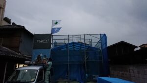 今日は、雨が降らなくて良かったですね。小学校の運動会もやっているところがありました。 こちらは、昨日の高砂町のK様邸です。 朝ポターンを設置して始まるところです。 家の奥行が長いのもありましたが、無事棟上げが終了しま […]