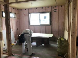 このボードが張り終われば完成の先が見えてきます。 「かっちゃん」棟梁よろしくお願いします。(^^♪
