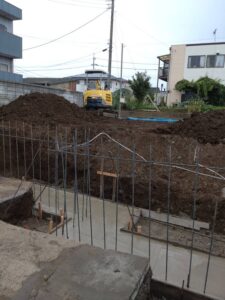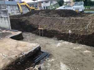 こちらは、若松町のO様邸です。土留め工事がはじまりました。 既存の土留めと絡んで土留めができて行きます。