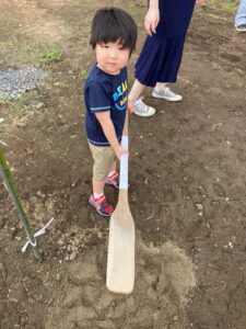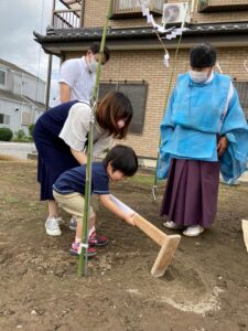 鍬入れは、ご家族全員行いました。 まずは、旦那様~「エイ!エイ!エイ!」