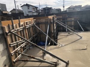 こちらは、若松町のO様邸です。土留めのコンクリートを打つ枠が完成しました。