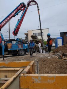 今日は、ポンプ車を準備してコンクリート打ちの準備バッチリです。