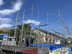 今日は、BK足場屋さんの出番です。 無事足場を組むことができました。