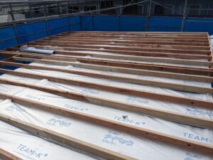 昨日は、大屋根の タイベックシルバー(3次防水)の上のタルキを打ち