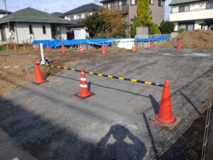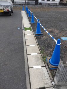 現在基礎養生期間ですのでコーンを設置しました。ブルーのコーンが在庫切れです( ゚Д゚)