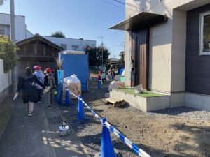 その後、本社に戻りましたら工務店前の金山神社に先ほどの天明小の生徒がいました。