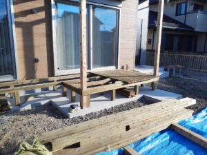 O様邸は、現在外構進行中です~ 写真は、デッキ途中の写真です。