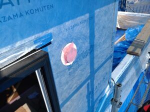 こちらは、若松町のO様邸です。 給気口周りは、「ストレッチガード」を貼り防水としています。