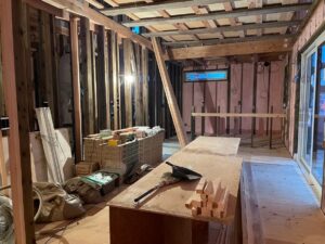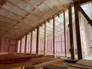 「かっちゃん」棟梁 ウレタン工事が終わり、天井下地~床張りの順で進めています。