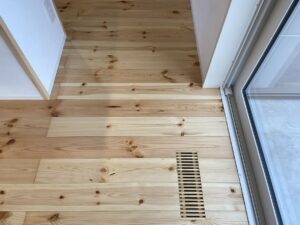 一番遠くのリビングの床したから暖かい空気がでていました(^^♪ 床は、無垢のパインを使っています。
