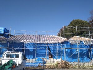 こちらは、今日の「地元建築家と造る家」上羽田の家 N様邸です。 タイベックシルバー(3次防水)の上からタルキでおさえる