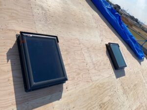 上羽田のN様邸です。トップライト下地の写真です。 タルキの断面欠損を防ぐタルキに断熱施工をしています。