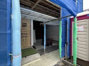 足場のネットは、ご近所に迷惑かける場所は、3mmメッシュ(濃いブルー)のネットをかけて使いわけをしています