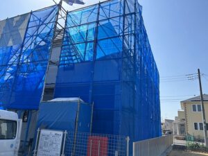 こちらは、地元建築家と造る家「上羽田の家」です。 足場に現場幕が張られました。(^^)/