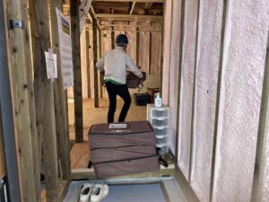床の養生を室内に運んでいる「正也ん」=頑張っています。