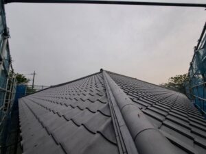 屋根工事も無事終わりました。 棟は、素丸でスッキリ仕上げました。(^^♪