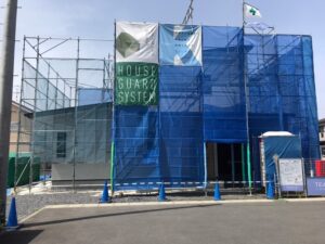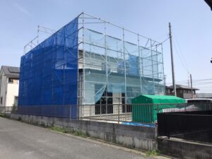 足場のネットも ごみがご近所に飛散しそうな場所(道路、隣地)は、3mmメッシュ(濃い青のネット)ご近所のご迷惑にならない面は、