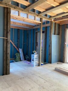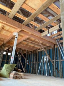 室内は、大きな吹き向けがあるので足場板がかかっています。