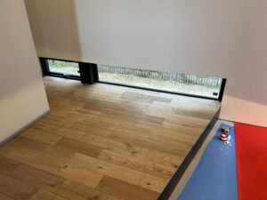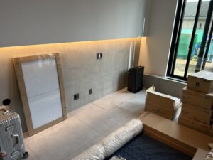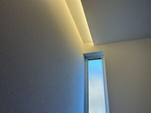 ダウンフロアになっているリビングですがこちらもふかし壁~間接照明! 実は、床下エアコンもこれから仕込んでいきます。