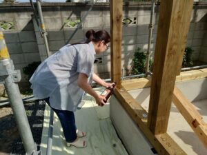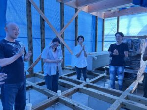 15時から 職人さんの顔合わせも含めでシート養生で暑い中、上棟式を行いました。