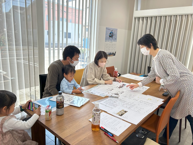 家具の打合せで盛り上がった場面です(^^♪  帰りに予約見学会の現場にも寄って頂きありがとうございました。