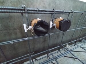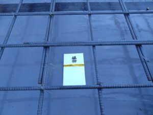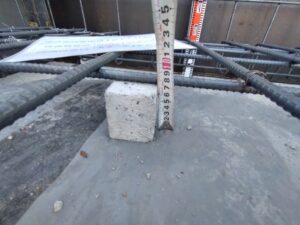 大事な要点として、基礎のかぶりの確認です。基準は、6cm以上ですが、6cmのサイコロでなく7cmを使います。