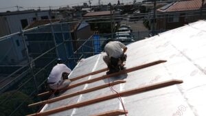 今日の屋根の下地を大工さんが行いました。順調です。暑い中お疲れ様でした。