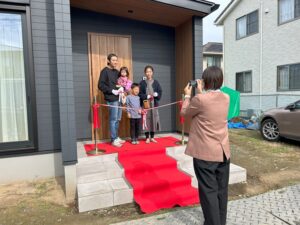 今日は、植下町のS様邸の引き渡し式を行いました。 テープカット前の写真を撮る様子の写真です(カメラマン:奈保子)
