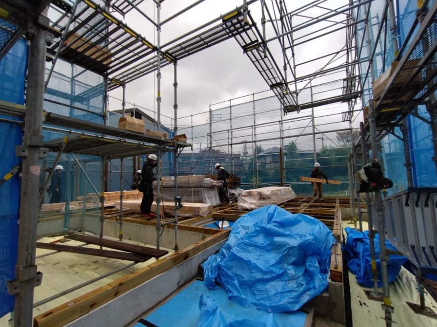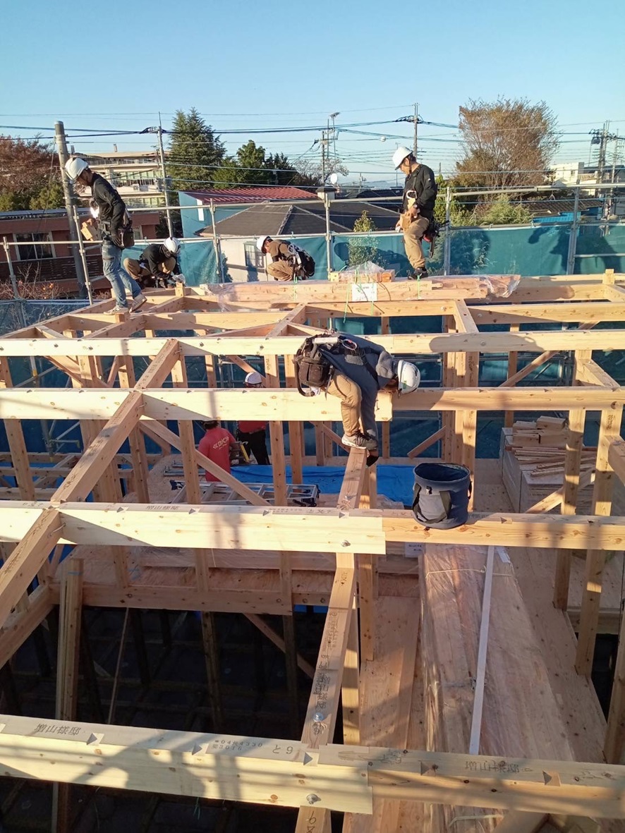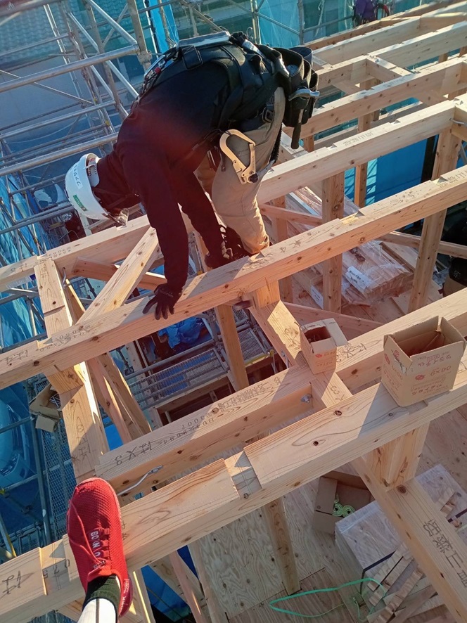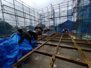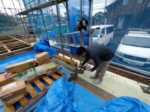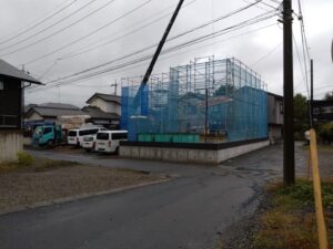 朝7時からレッカー車の運転手さん準備してもらこんな雰囲気での建て方工事がはじまりました。