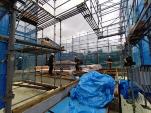 レッカーを利用でどんどん入れていき~柱を建て~梁を組んでいきます。