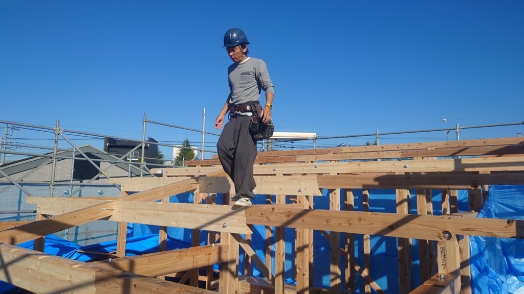 「イケメン大工カワマー」まずは、母屋の上で様子見ですかね~ 昨日は、ここまで建て方専門業者が行いました。