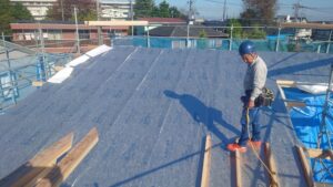 屋根のシートを取り、大屋根の屋根下地(専門用語で野地といいます)の工事です。
