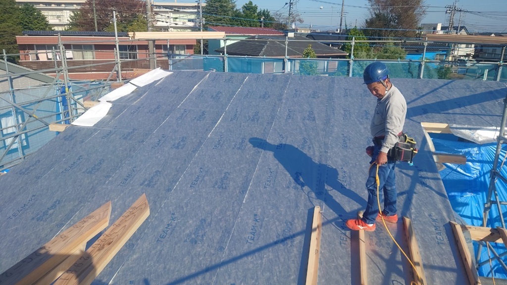 タルキの下に「タイベックシルバー」を敷きます。 これは、3次防水(防水は、あまり期待してなくてついでのような感じです。どちらかというと遮熱の効果が一番です!) にもなります。 1次防水は、屋根(ガルバ) 2次防水は、改質アスファルトルーフィング 通常は、ここまでが屋根の防水仕様